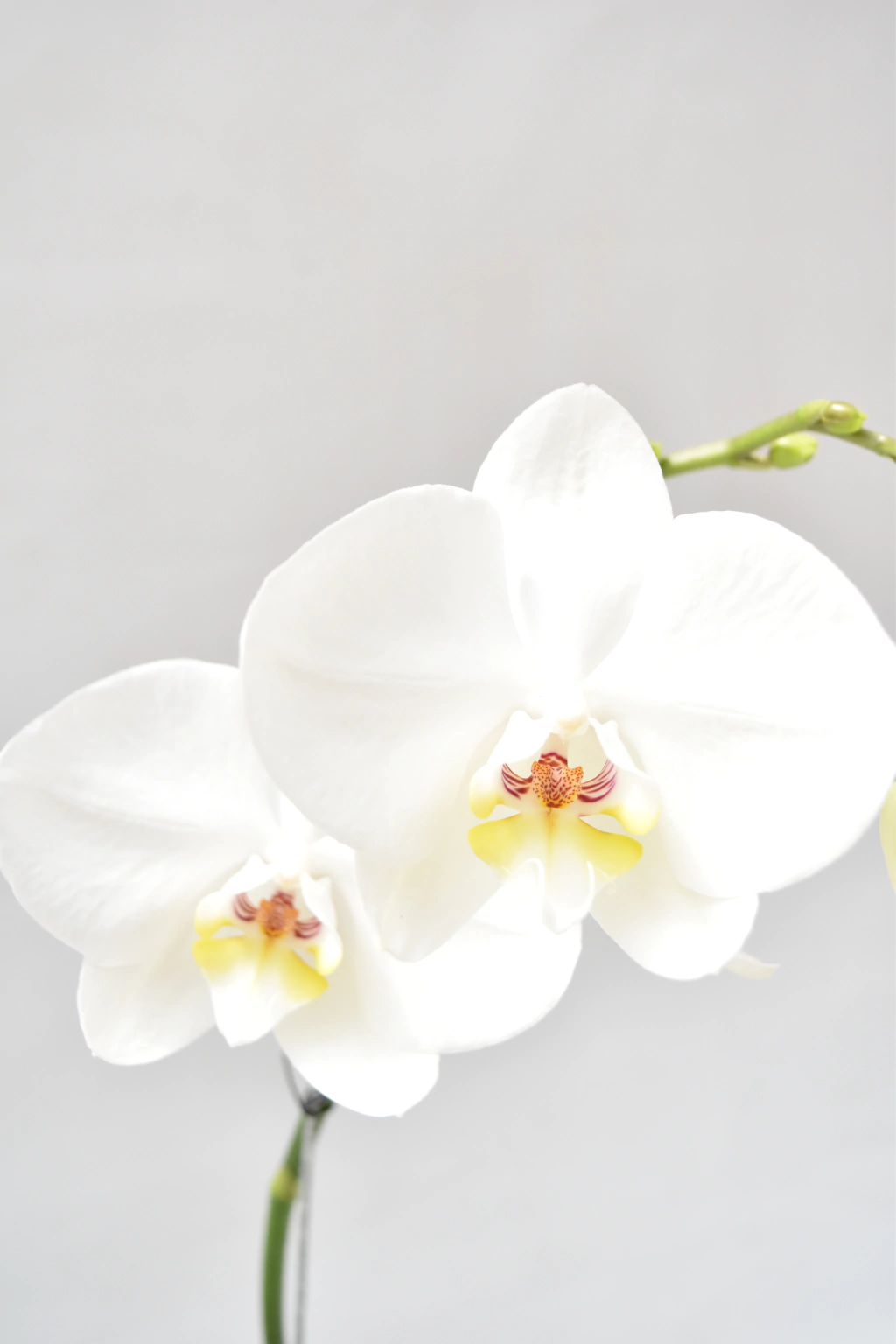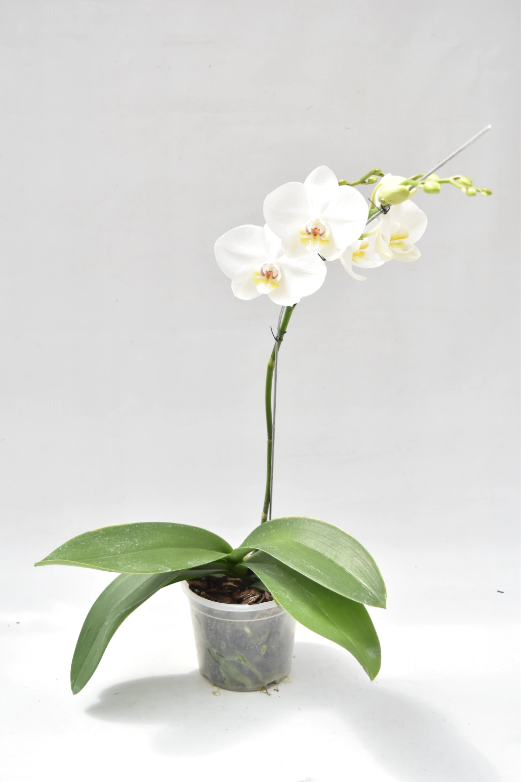 Las Phalaenopsis están plantadas en una maceta transparente, lo que permite ver sus raíces.