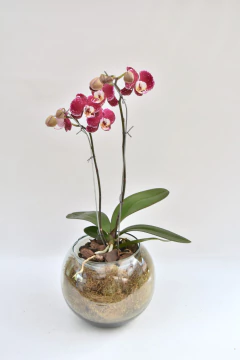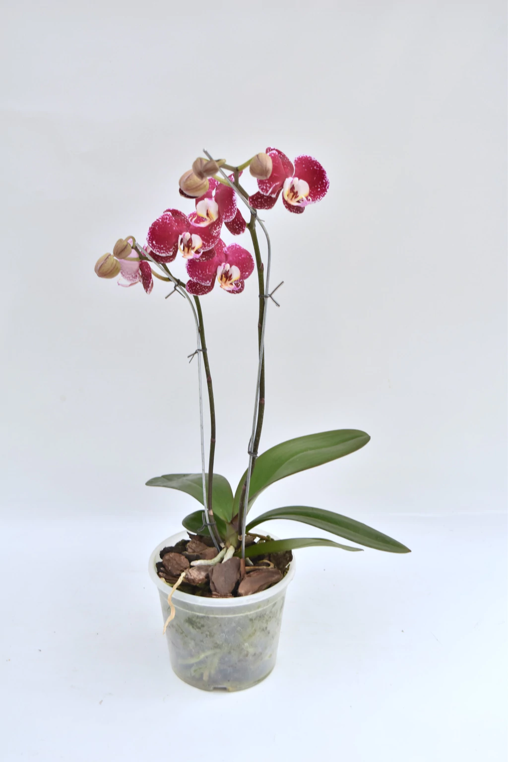 Las Phalaenopsis están plantadas en una maceta transparente, lo que permite ver sus raíces.