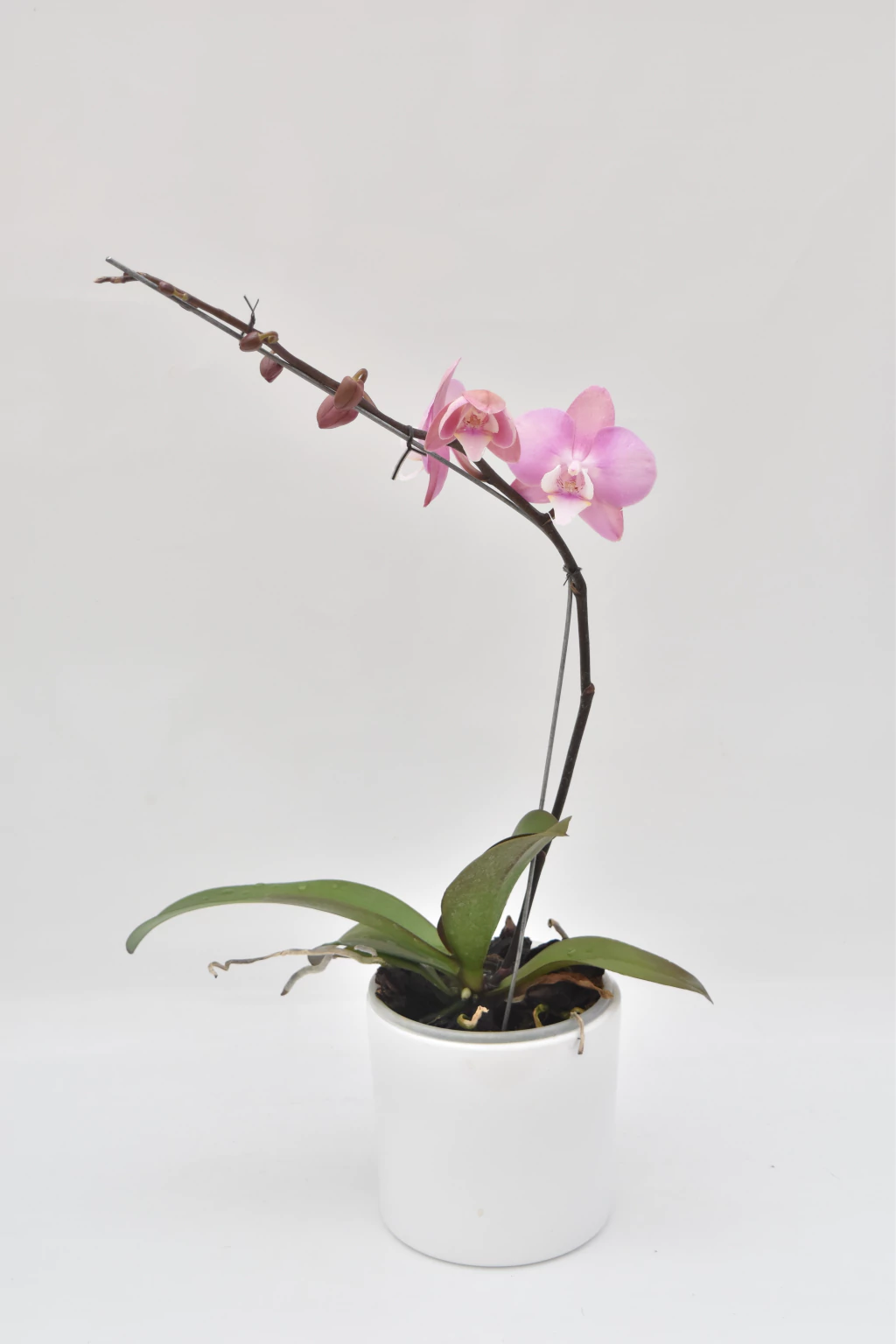 Las Phalaenopsis están plantadas en una maceta transparente, lo que permite ver sus raíces.